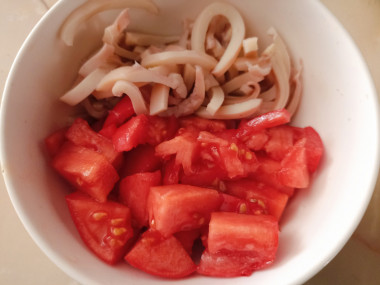 Помидоры промойте под проточной водой и обсушите. Удалите плодоножку. Если помидоры большие, то аккуратно их нарежьте, оставляя кусочки цельными, чтобы мякоть не отслаивалась от стенок помидора. Если вы выбрали помидоры черри, то их достаточно просто разрезать на две части. Нарезанные помидоры добавьте в салатник к кальмару.