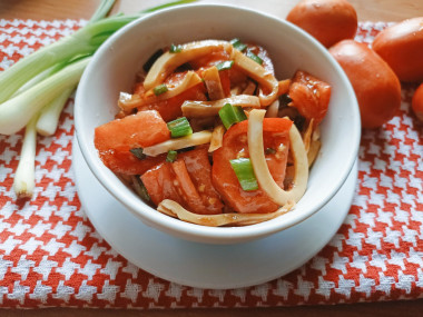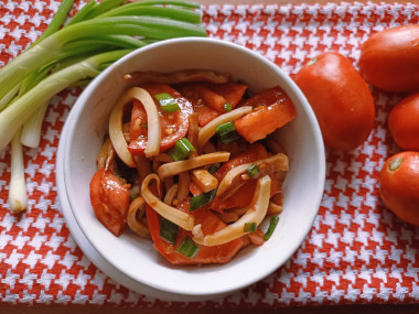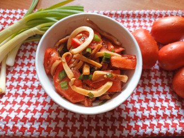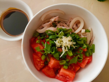 Приготовила салат кальмары помидоры. Отваренные кальмары нарезала соломкой, помидор- ломтиками. Мелко нарезала пёрышки зелёного лука, измельчила зубчик чеснока. Все ингредиенты соединила в салатнике и залила соусом из растительного масла, сои и специй. Салат яркий, сочный, пикантный, с колоритом азиатской кухни! Очень вкусно! Спасибо автору за рецепт!