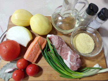 Калорийность продуктов: Лук, Картошка, Помидоры, Морковь, Чеснок, Лавровый лист, Растительное масло, Бекон, Соль, Вода, Зелень, Душистый перец, Кускус