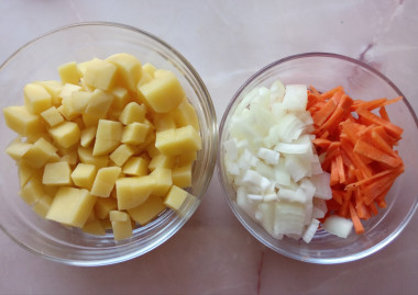 Картофель нарежьте кубиками небольших размеров примерно 1 см на 1 см.