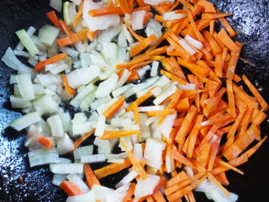 В оставшееся масло добавьте нарезанные лук и морковь, обжарьте их на сильном огне до золотистого цвета, не забывайте постоянно перемешивать, чтобы зажарка не пригорела.