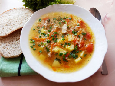 Приготовила суп с кускусом. Вместо бекона взяла кусочек свинины без косточки, нарезала небольшими полосками, обжарила на растительном масле. Свинину сняла со сковороды, здесь же обжарила лук с морковью. Мясо готовится дольше, чем бекон, поэтому я варила его вместе с обжаренными овощами, картофелем и кускусом до готовности картофеля. Затем добавила нарезанные помидоры без кожицы и чеснок. При подаче посыпала зелёным луком и укропом. Суп получился яркий, вкусный, сытный, ароматный. Спасибо автору за рецепт!
