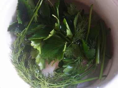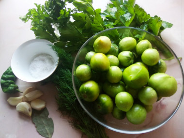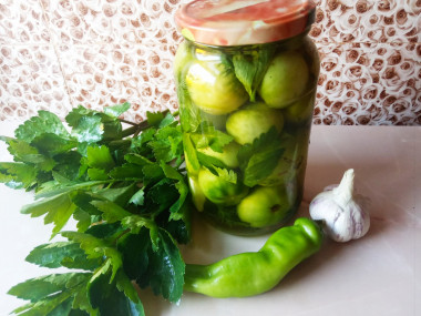 Как сделать зеленые помидоры по грузински? Подготовьте все необходимые ингредиенты. Подберите твердые среднего размера помидоры, помойте их и высушите. Каждую дольку чеснока разрежьте на 4 части, а стручок перца, очистив от семян, полукольцами. Приготовьте отвар. Для этого в кипящую воду положите сельдерей и петрушку, поварите 5 минут, уберите зелень и дайте отвару остыть, после чего добавьте соль. В чистые подготовленные банки плотно уложите помидоры, прокладывая каждый слой чесноком, перцем, зеленью. Заполненные банки залейте отваром, закройте крышками и храните в прохладном месте. Через две недели помидоры должны быть готовы!