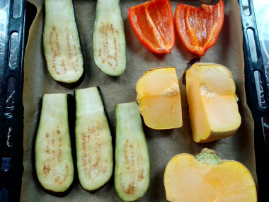 Пока баклажаны на подготовительном этапе, займемся остальными овощами. Красный и очень мясистый болгарский перец разрезаем пополам, вынимаем середину. Кусочек тыквы от кожуры не очищаем. Овощи моем, но на кусочки не разрезаем, выкладываем на противень, застеленный бумагой для выпечки или силиконовым ковриком. Выпекаем в духовке, разогретой до 180 градусов, в течение 15 минут.