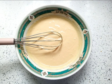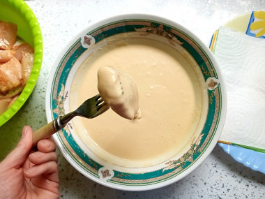 Все тщательно перемешайте до однородности. Кляр должен получиться полугустым, чтобы он держался на рыбе, а не стекал с нее. Если у вас кляр получился слишком жидким, можно подсыпать еще 1-2 ст. л. муки.