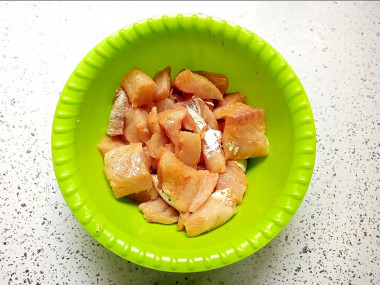 Филе рыбы вымойте и обсушите бумажными салфетками. Затем нарежьте филе порционными кусочками.
