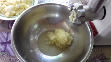 Кабачки прокрутите на мясорубке и выложите в сито, чтоб ушла лишняя жидкость.