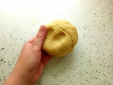 Замесите тесто. Сначала перемешайте его столовой ложкой, а затем быстро сформируйте из теста шар. Скорость в работе с песочным тестом обусловлена скоростью таяния масла. Чем дольше замешивать, тем сильнее тает масло от тепла рук, тем больше потребуется муки (иначе тесто будет жидким), соответственно, тем жёстче будет корж. Мы стараемся избежать всего этого.