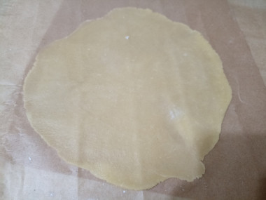 Возьмите один комочек и раскатайте скалкой на куске пергаментной бумаги для выпечки в круг. Не страшно, если он получается не ровным, мы потом его обрежем. Не забывайте присыпать бумагу и скалку мукой, чтобы они не прилипали к тесту.