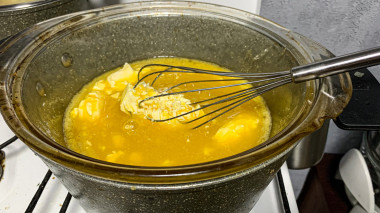 Добавьте ко взбитым яйцам масло, мед и соду. Соду не гасите!