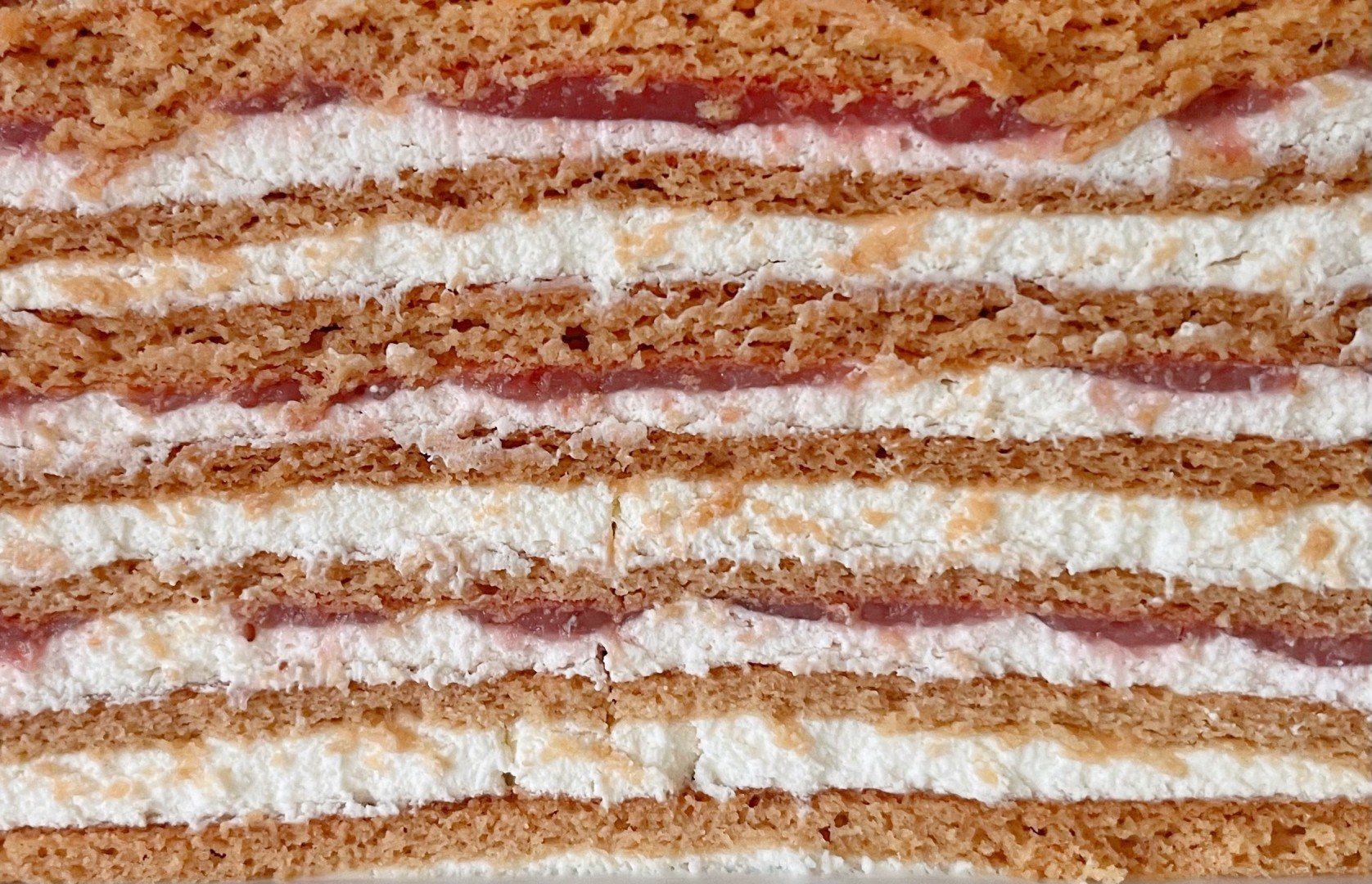 На день рождение сына решила сделать медовик. Медовые коржи очень ароматные, но крем хотелось сделать воздушным, поэтому в соотношении один к одному добавила к сметане взбитые сливки. Еще немного клубничного конфитюра и будет топовый вариант. Ребенок обожает ягодные начинки - это оказалось кстати.
