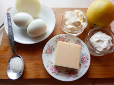 Как сделать салат нежный с сыром? Подготовьте продукты. Яйца предварительно отварите, охладите и очистите от скорлупы. Лук также очистите. Сыр выбирайте натуральный, без растительных добавок, чтобы был вкусный, не сильно острый и соленый. Яблоки лучше подойдут сладких сортов.