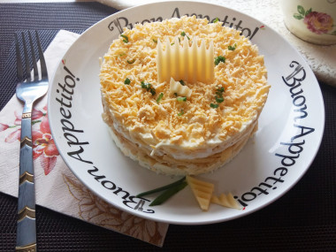 Приготовила салат нежность с сыром. На свой вкус сократила количество яиц. Салат замечательный, сочный, действительно очень нежный и лёгкий. В этот раз я приготовила его к ужину, как самостоятельное блюдо, но и для праздничного стола этот салат прекрасно подойдёт. Спасибо, katushafin!