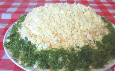 Верх салата посыпьте натертым на мелкой терке желтком. Можете также украсить зеленью. Уберите готовый салат Нежный с сыром в холодильник на пару часов, он тогда станет сочнее. Затем подавайте к столу. Приятного аппетита!