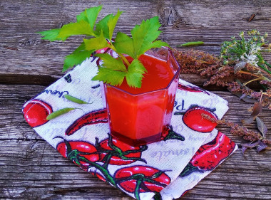 Знаю рецепт с добавлением уксуса. Такой томатный сок можно использовать и в качестве соуса к мясу или рыбе.