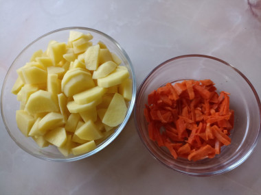 Очищенные картофель и морковь нарезаем для супа. Картофель нарежьте брусочками, ломтиками или кубиками.