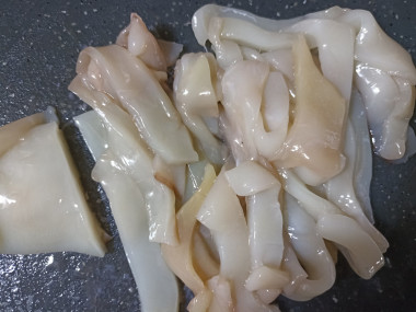 Кальмары вымойте, обсушите, очистите от кожицы и пленок (если кальмары неочищенные), удалите хорду, если она есть. Подготовленные кальмары нарежьте кольцами.