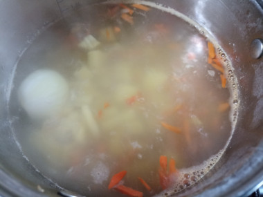 В кастрюлю влейте рыбный бульон или воду, выложите целую луковицу и поставьте на огонь. Доведите бульон до кипения на среднем огне.