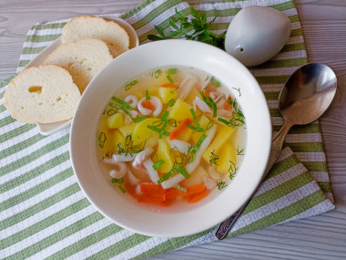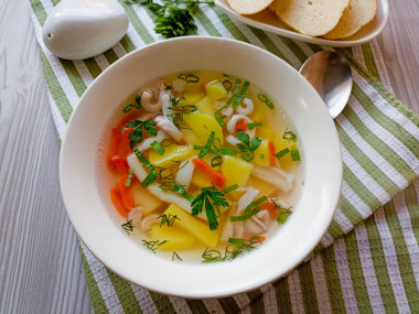 Этот суп мне так понравился, что в ближайшие месяцы я собираюсь освоить сразу несколько рецептов различных супов с добавлением кальмаров. Я очень люблю кальмары, но раньше готовила с ними только салаты, да пару раз кольца в кляре жарила. А оказалось, что обычный суп из картошки и морковки может стать настоящим шедевром именно благодаря кальмарам.
