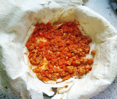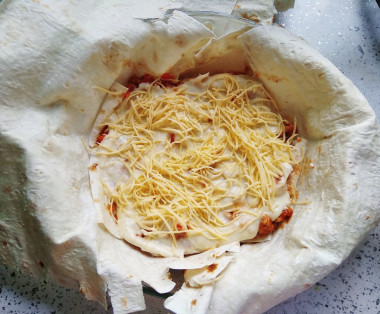 В конце подверните края лаваша, накрывая начинку. Сверху положите еще один лист лаваша - получится очень аккуратно, и при запекании ничего не вытечет.