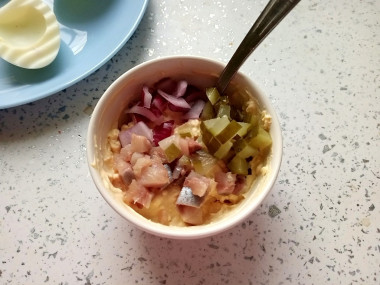 Откладываем небольшое количество кубиков сельди для украшения. Добавляем остальную рыбу, лук и огурец к крему из желтков. Приправляем массу солью и молотым перцем по вкусу. Аккуратно перемешиваем, здесь блендер уже не используем, пусть это будут кусочки в яичном креме, чтобы они чувствовались во время еды.