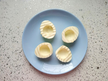 Охлажденные яйца очищаем от скорлупы и разрезаем на две равные половинки. Делать это нужно очень аккуратно, чтобы не нарушить целостность белков. Желтки перекладываем в глубокую тарелку, добавляем майонез и смешиваем до однородности. Лучше всего воспользоваться блендером, тогда удастся не просто смешать, а получить нежную кремообразную текстуру.