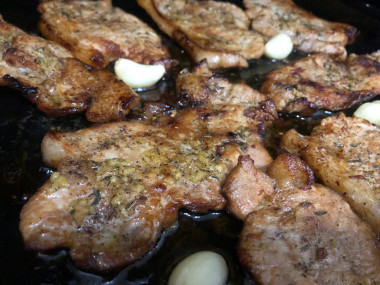Обжаренное мясо прямо в сковороде полейте маслом со специями и чесноком.