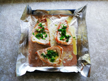 Сухие ароматные травы я заменила свежим укропом, петрушкой и зеленым луком, их потребовалось совсем немного. Выложила зелень и нарезанную дольку чеснока на мясо. Сверху добавила растопленное сливочное масло.