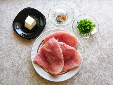 Нарежьте карбонат на порционные кусочки, поперёк волокон, толщиной 1,5-2 см. Немного отбейте мясо с помощью кухонного молоточка. Чтобы мясо по краям не рвалось при отбивании, накройте его пищевой плёнкой.