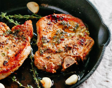 После запекания мясо немного уменьшится в размере и подрумянится. Сочный свиной карбонат жареный на сковороде готов! Извлеките сковороду из духовки, переложите мясо на тарелку и подавайте к столу. Приятного аппетита!