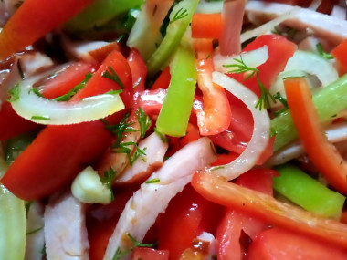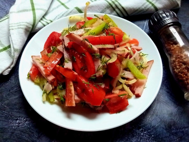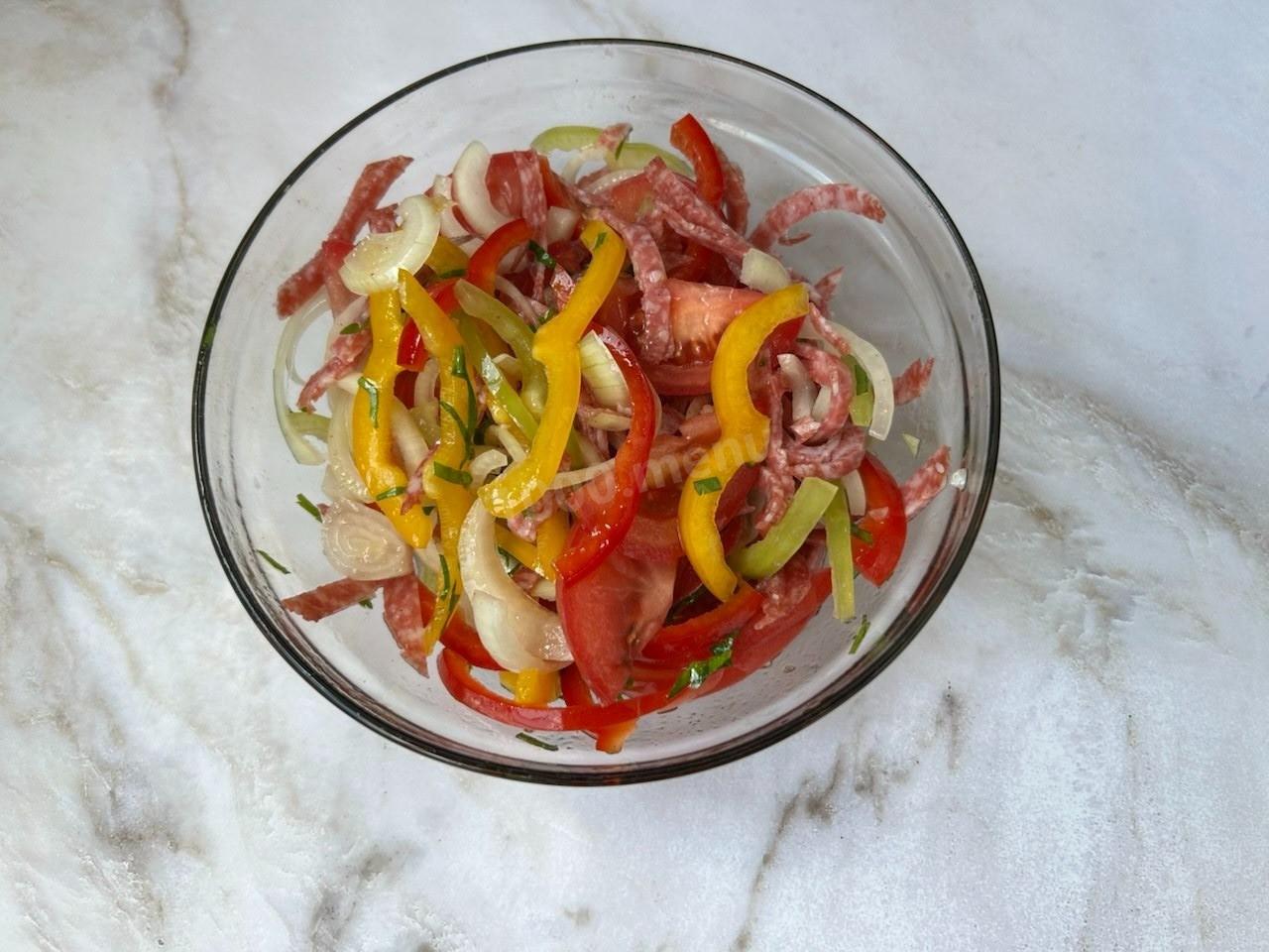 Венгерский салат давно уже привлёк мое внимание, но немного смущал состав. Все же решила попробовать приготовить. Мне больше всего понравилось, что основу салата составляют свежие овощи. У меня как раз было несколько болгарских перцев разного цвета. Нарезала их соломой. Помидоры были сорта "сливки", они не сильно крупные, поэтому нарезала их на дольки. Лук взяла белый салатный, люблю его за лёгкую сладость. Понравился совет раздавить зубчик чеснока, чтобы пошел сок, получилось очень ароматно. Салями я заменила на карбонат, нарезала его так же тонкой соломой. Что касается заправки, мне непонятно было как можно делать её на основе бульона) Но, все-таки взяла овощной бульон, который варила для супа-пюре. Он состоял из лука, моркови, картошки, петрушки и кабачка. Добавила все остальные ингредиенты, перемешала и заправила салат. Салат перед подачей охлалила. В итоге я нисколько не пожалела, что решилась приготовить этот замечательный салат. Он очень вкусный! Сочность просто зашкаливает. Мясная составляющая отлично сочетается с овощами. А заправка вообще самая вкусная, дочка всю её вымакала хлебом) Этот рецепт стоит внимания, обязательно приготовьте.