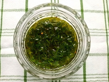 После того как все ингредиенты нарезаны, можно приступать к приготовлению заправки для салата. Остывший овощной бульон смешайте с оливковым маслом первого отжима. Добавить все необходимые специи - соль, порошок перца чили и другие приправы по желанию.