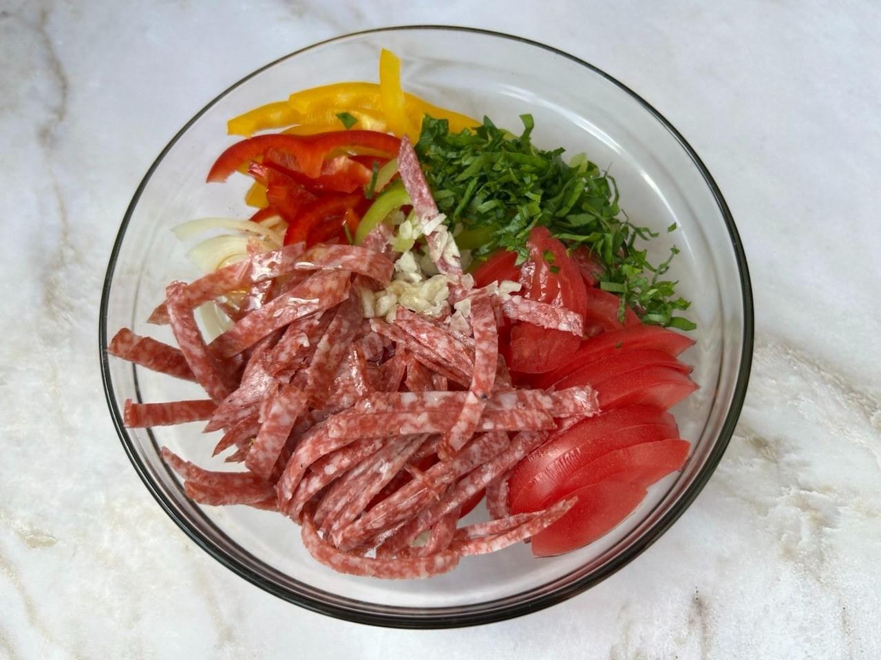 Салями можно заменить на охотничьи колбаски, ветчину или копчёную курицу.