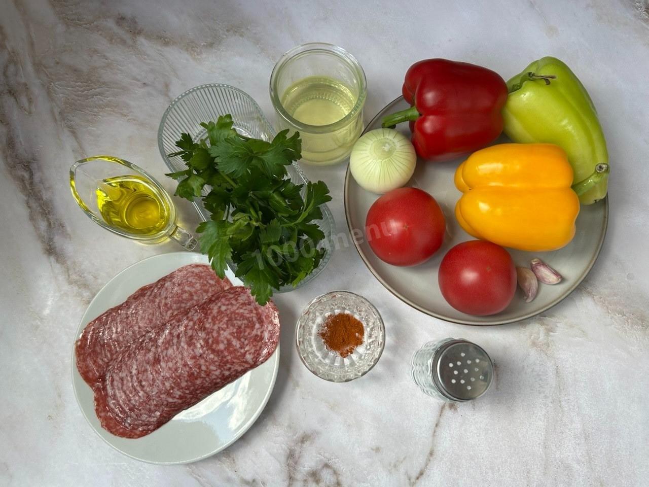 Как сделать Венгерский салат с колбасой и перцем? Для начала подготовьте все необходимые ингредиенты по списку. Для салата лучше всего подойдут большие мясистые сладкие перцы разных цветов. В идеале это должны быть перцы красных, желтых и зеленых цветов. Так салат в конечном итоге будет выглядеть ярко, красиво и интересно. Салями можно заменить на другой вид мяса (например, на охотничьи колбаски, ветчину или копчёную курицу).