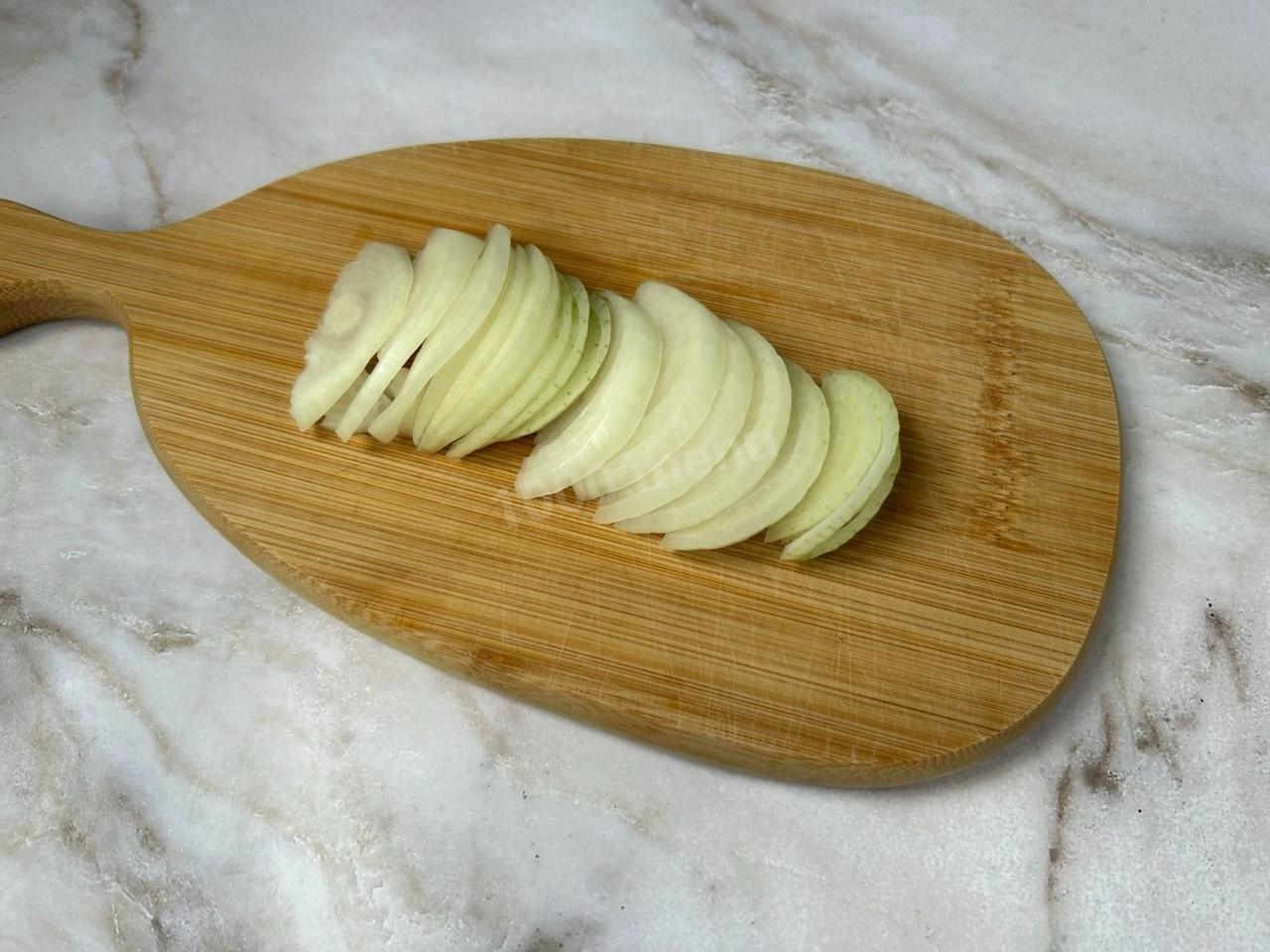 Репчатый лук очистите от шелухи, промойте проточной водой и обсушите. Далее лук нарежьте тонкими полукольцами.