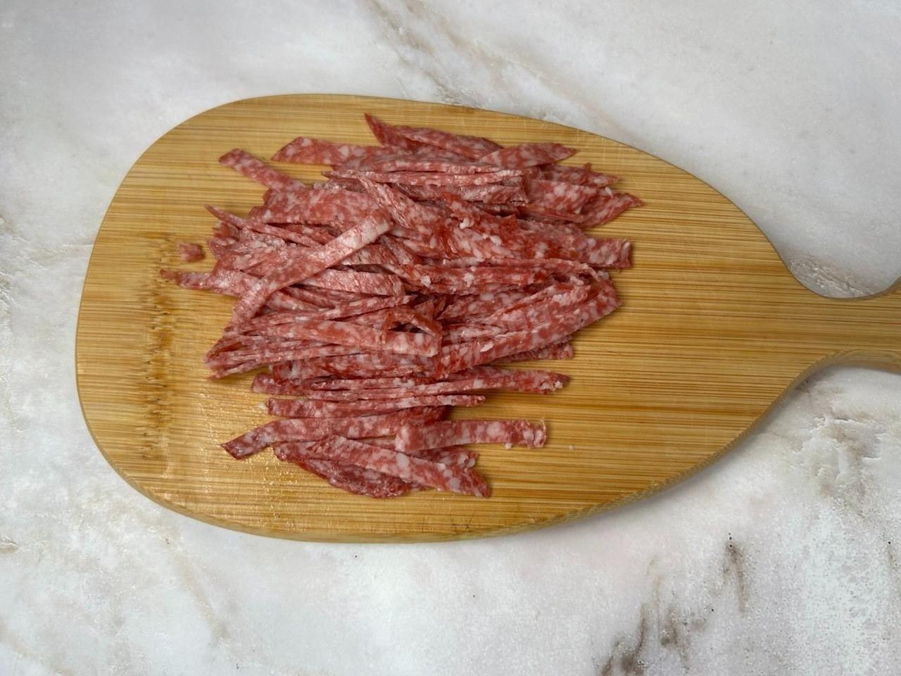 Салями, нарежьте на кружочки, а затем эти кружочки на полоски.