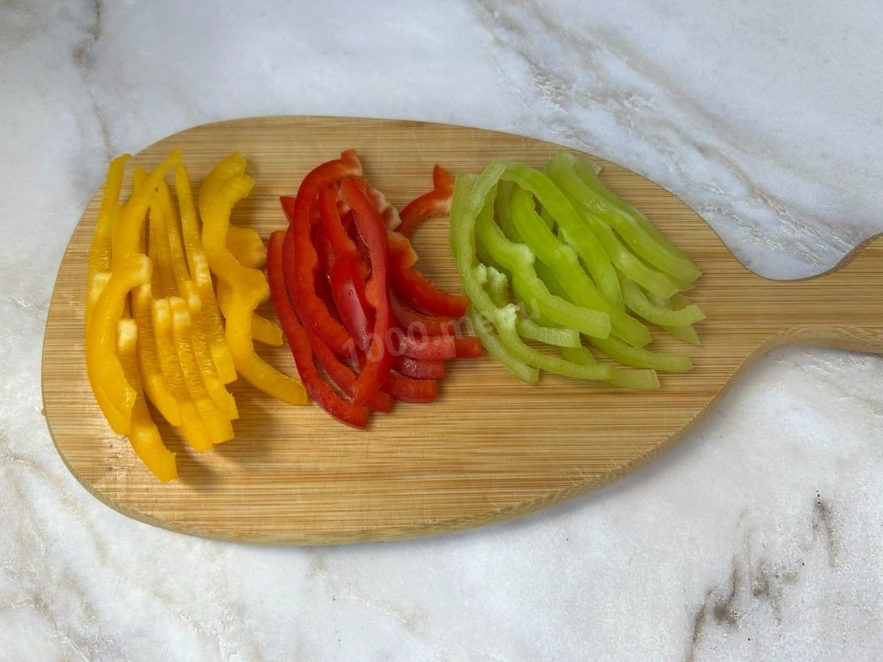 Болгарские перцы промойте под холодной проточной водой. Затем срежьте с них часть с плодоножкой и выньте все семечки и внутренние перепонки. Мякоть болгарского перца нарежьте на тонкие полоски.