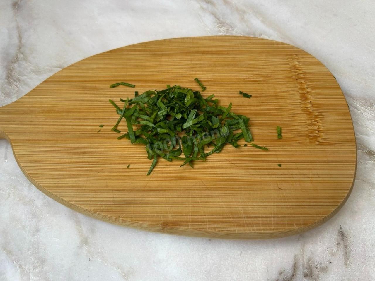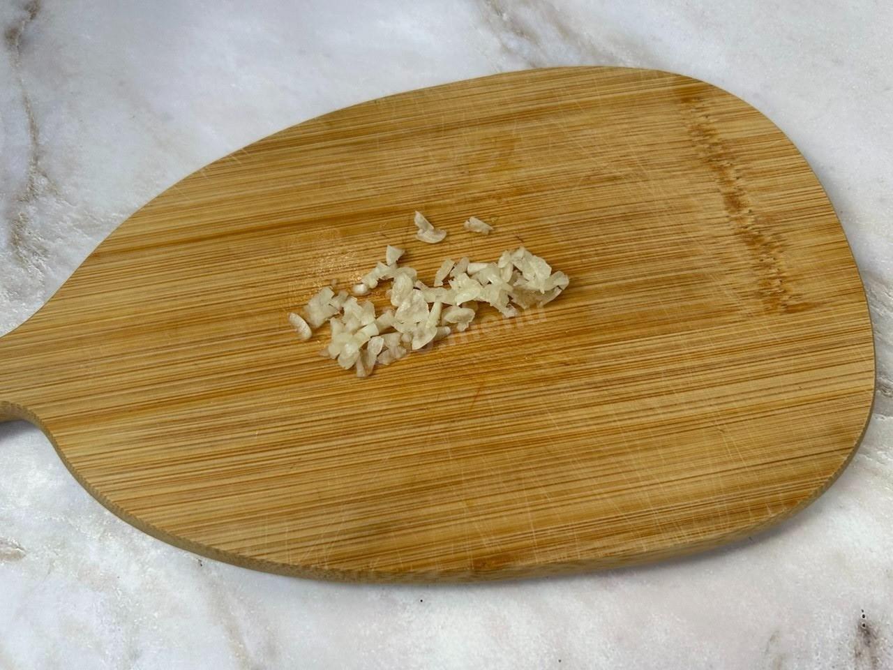 Чеснок очистите и промойте. Положите зубчик чеснока на разделочную доску и широкой частью кухонного ножа раздавите его таким образом, чтобы из него пошел сок. А далее мелко его порубите.