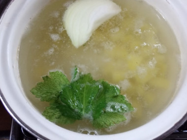 В кастрюлю влейте чистую воду, положите в неё целую очищенную луковицу, поставьте на огонь и доведите до кипения. В некоторых рецептах пишут, что суп можно варить в той же воде (вернее бульоне), в котором варилось сердце. Но мне кажется это не совсем правильным, так как до некоторых протоков в сердце добраться сложно, поэтому при варке бульон может потемнеть от остатков крови. Поэтому я предпочитаю бульон от сердца слить, а варить суп на чистой воде.