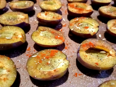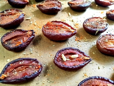 Сливы я взяла плотные, не очень сладкие и не сочные. Они как раз подошли для этой закуски. Половинками заполнила большой стандартный противень. Готовой смеси не было, поэтому составила свою из морской соли, розмарина, зиры, паприки и базилика.