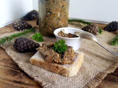 Жарьте грибную икру из вареных с луком и морковью на медленном огне примерно 30 мин, помешивая. Добавьте уксус, перемешайте и жарьте еще около 5 минут. Выключите огонь. Заранее простерилизуйте банки. Вымойте их с содой и поставьте в холодную духовку вверх дном. Включите печь на 150 ℃ и стерилизуйте банки объемом 0,5 л - 10 мин, 1 л - 15 мин. Крышки вымойте и прокипятите. О выборе и стерилизации банок читайте в отдельных статьях внизу под описанием рецепта.