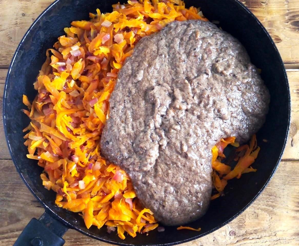 В разогретое масло выложите морковь и лук, обжаривайте овощную смесь до мягкости морковки и прозрачности репчатого лука на среднем огне, примерно минут 7. Затем в сковороду к овощам отправьте грибную массу. Добавьте соль и черный молотый перец, перемешайте.
