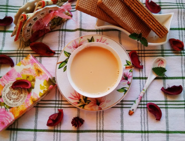 Иногда хочется побаловать себя вкусным напитком со сладостями. На этот раз дочка тоже захотела принять участие в моем чаепитии) Я выбрала молочный чай, тем более мы пришли с мороза и очень хотелось согреться. Чай взяла крупнолистовой без добавок. Сразу заварила его в бокале и пока заварка настаивалась мы накрыли на стол. Свежезаваренный чай в разы вкуснее! Как и указано в рецепте сначала в чашки налила молоко, а затем чай. Добавила совсем немного сахара. Чай получился красивого цвета, он вкусный, чувствуется нежность молока. Когда я была маленькой девочкой, мама любила такой молочный чай, только без сахара. Я тогда не понимала его вкус. А вот сейчас он мне очень нравится и даже моей дочке понравился. Мы с ней как английские леди пили пятичасовой молочный чай вприкуску с вкусняшками. Спасибо за рецепт, воспоминания и удовольствие, полученное от чаепития в компании доченьки)