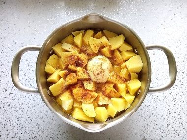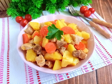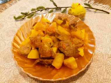 Готовить я решила в кастрюле, в которой можно жарить. Сначала обжарила кусочки свинины до золотистой корочки. Затем выложила крупные кусочки моркови и томатную пасту. Немного поджарила и выложила картошку. Картошку нарезала не слишком крупно, но и не мелко. В рецепте не используется лук, но я решила положить в кастрюлю целую луковицу, чтобы она отдала свой сок. Таким образом получилось вкусно, а дочка не обнаружила нелюбимый лук). Из специй у меня универсальная приправа и немного перца. Тушила картошку с мясом примерно пол часа на маленьком огне до мягкости картошки.