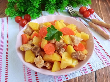 Очень вкусное блюдо! Мясо мягонькое, картошечка нежная, соус бархатистый! Морковка придает небольшую сладость, а томат кислинку, в общем полная гармония!