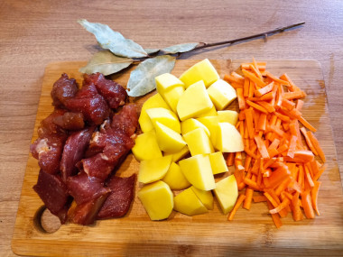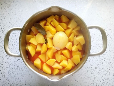Картофель очистите, обмойте и нарежьте крупными кубиками.