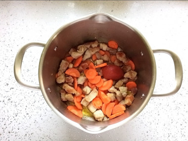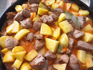 Влейте в сковороду горячую воду или бульон, чтобы жидкость почти полностью покрыла мясо и овощи. Добавьте лавровые листья.