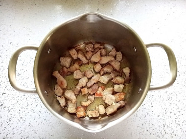 В сковороде разогрейте растительное масло. О том, как подобрать идеальную сковороду, а также как правильно выбрать растительное масло, читайте в отдельных статьях, ссылки в конце рецепта. Обжарьте на сковороде на среднем огне свинину в течение около 8 минут до появления румяной корочки.