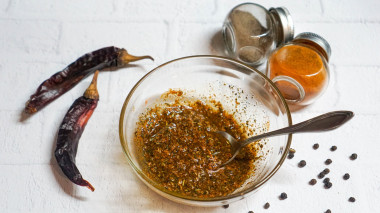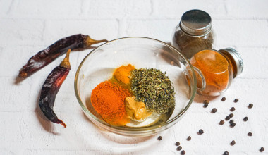 Теперь приготовьте маринад. В большой миске соедините растительное масло, горчицу, пропущенные через пресс зубчики чеснока, паприку, куркуму, орегано, смесь прованских трав. Все перемешайте вилкой до однородности и растворения соли.