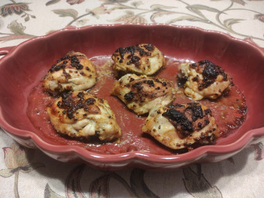 Чудесный рецепт на каждый день – бедра куриные на противне. Время активного приготовления минимально. Хозяйке нужно подготовить бедра и маринад. А дальше магия ингредиентов все сделает сама. Я готовила по рецепту, единственное отступление – положила французскую горчицу. Этого делать не стоит, лучше использовать классическую. Зернышки горчицы сильно потемнели, они не придали жесткости корочке, но отразились на итоговом виде блюда. В общем маринадом и получившимся блюдом довольна. Запекалась моя курочка 45 минут и была с удовольствием съедена домочадцами с рисом и овощами.